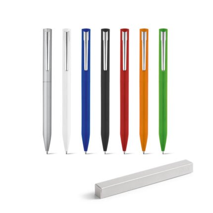 Esferográfica em alumínio com corpo colorido e escrita em preto