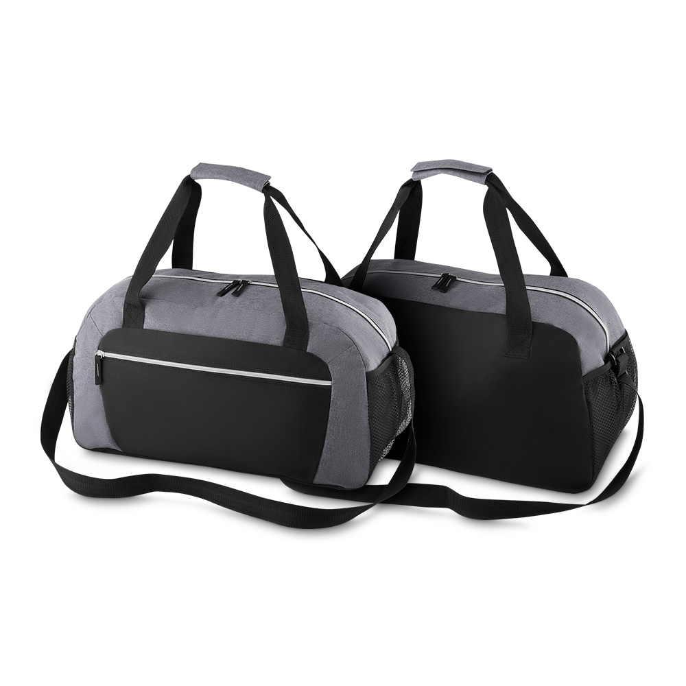 Mala esportiva confeccionada em poliéster 600 e 300, resistente e versátil para o dia a dia, academia ou viagens curtas. Possui zíper frontal para acesso rápido, bolsos laterais que facilitam a organização de objetos menores, além de alça de mão reforçada e alça de ombro para transporte confortável. Um modelo funcional, com ótimo espaço interno e acabamento prático para personalização corporativa.