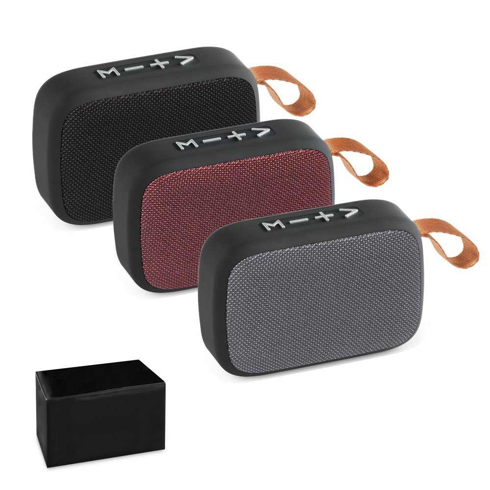 Caixa de som portátil 3W em ABS com tecido em poliéster e acabamento emborrachado, BT v5.0, rádio FM, leitor microSD e autonomia de até 2h, acompanhada de cabo USB-C e fornecida em caixa presente, unindo conectividade, praticidade e excelente apresentação.