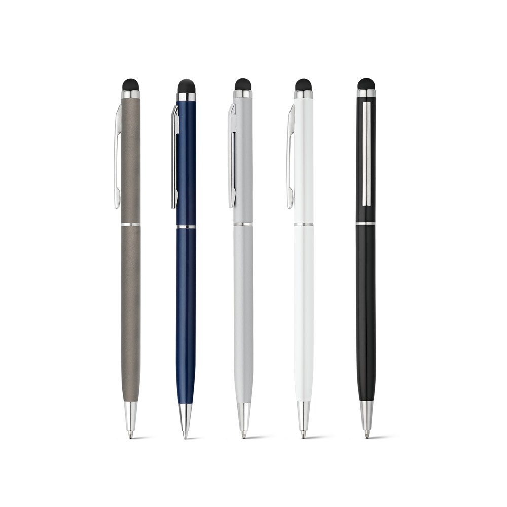 Caneta em alumínio com mecanismo twist, ponteira touch e escrita azul até 1,5 km. Medidas: ø8 x 135 mm.