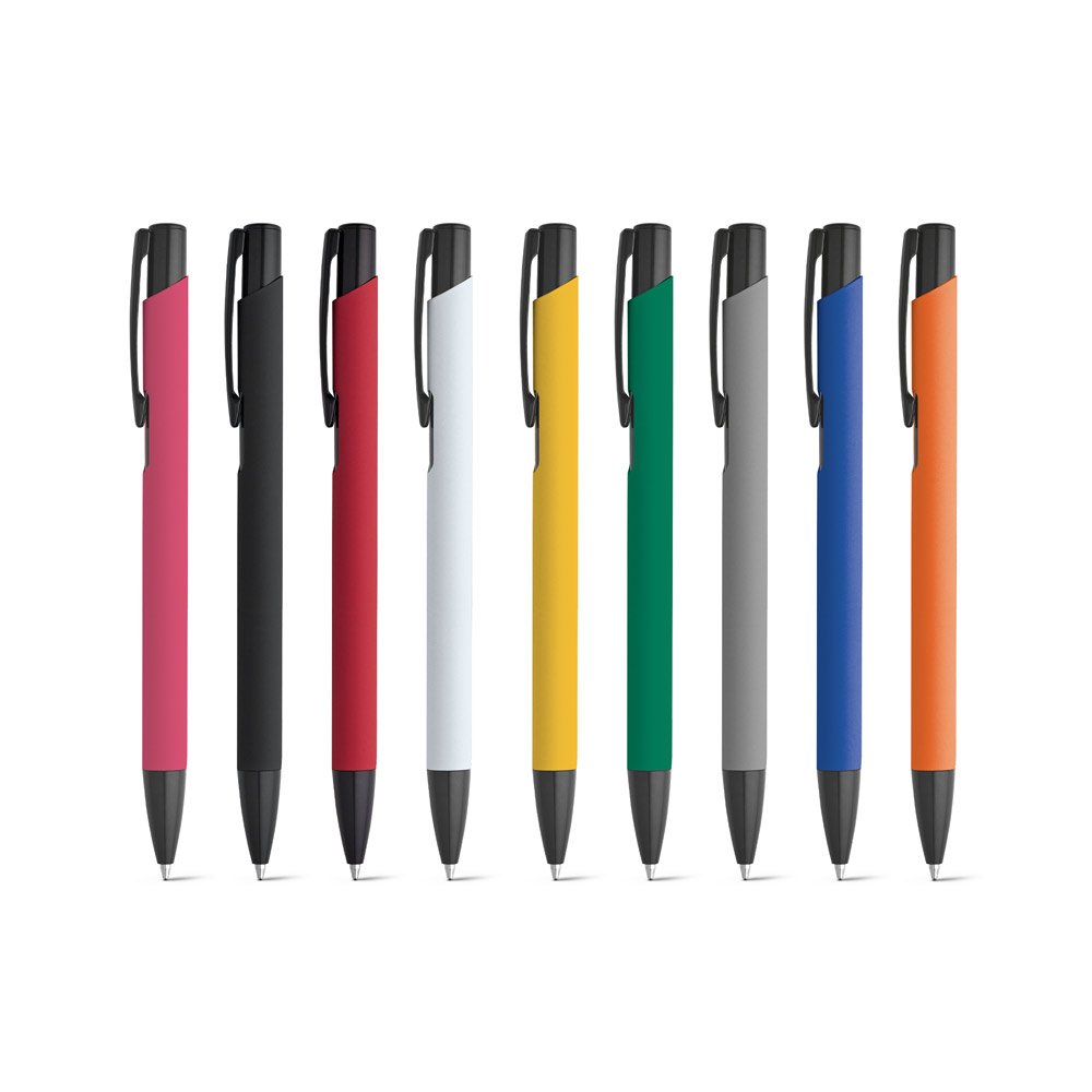 Esferográfica em alumínio com corpo colorido e acabamento emborrachado, proporcionando toque macio e escrita confortável. Possui clipe em metal que agrega resistência e visual moderno. Escrita na cor preta com alcance de até 1,5 km, ideal para uso diário, brindes corporativos e ações promocionais com alto valor percebido. Medidas: ø10 x 137 mm.