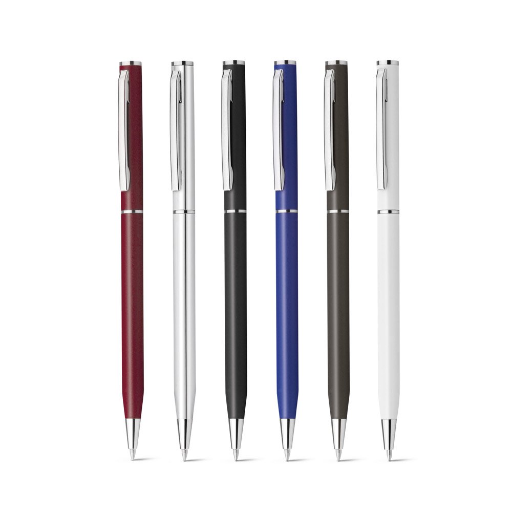 Esferográfica em alumínio com mecanismo twist para acionamento prático e clipe em metal que garante resistência e acabamento sofisticado. Possui escrita azul com alcance de até 1,5 km, oferecendo durabilidade e conforto no uso diário. Modelo elegante, ideal para brindes corporativos e ações promocionais de maior valor agregado. Medidas: ø7 x 129 mm.