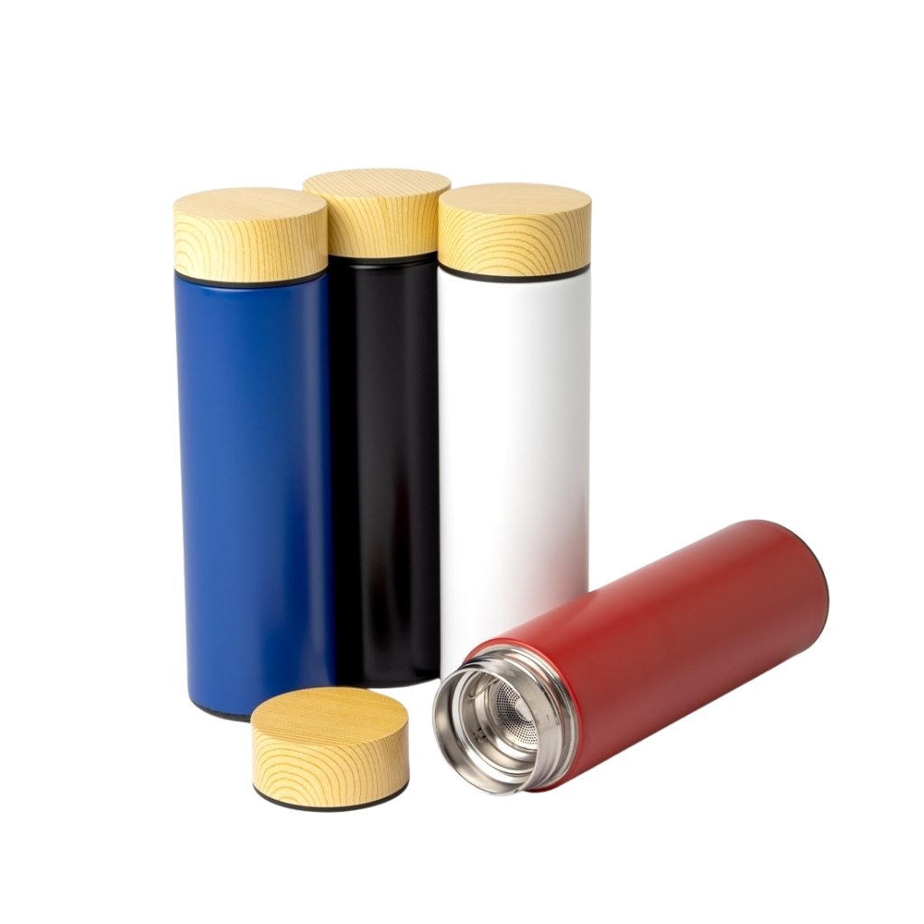 Garrafa térmica de 450ml fabricada em inox com parede dupla, projetada para manter bebidas quentes ou frias por mais tempo com eficiência e segurança no uso diário. Possui infusor interno que permite preparar chás, ervas e bebidas aromatizadas diretamente na garrafa, agregando funcionalidade e versatilidade. A tampa rosqueável conta com detalhe plástico estilizado de madeira, proporcionando acabamento moderno e sofisticado que valoriza o produto e o torna uma excelente escolha para ações promocionais e personalizações de alto padrão.