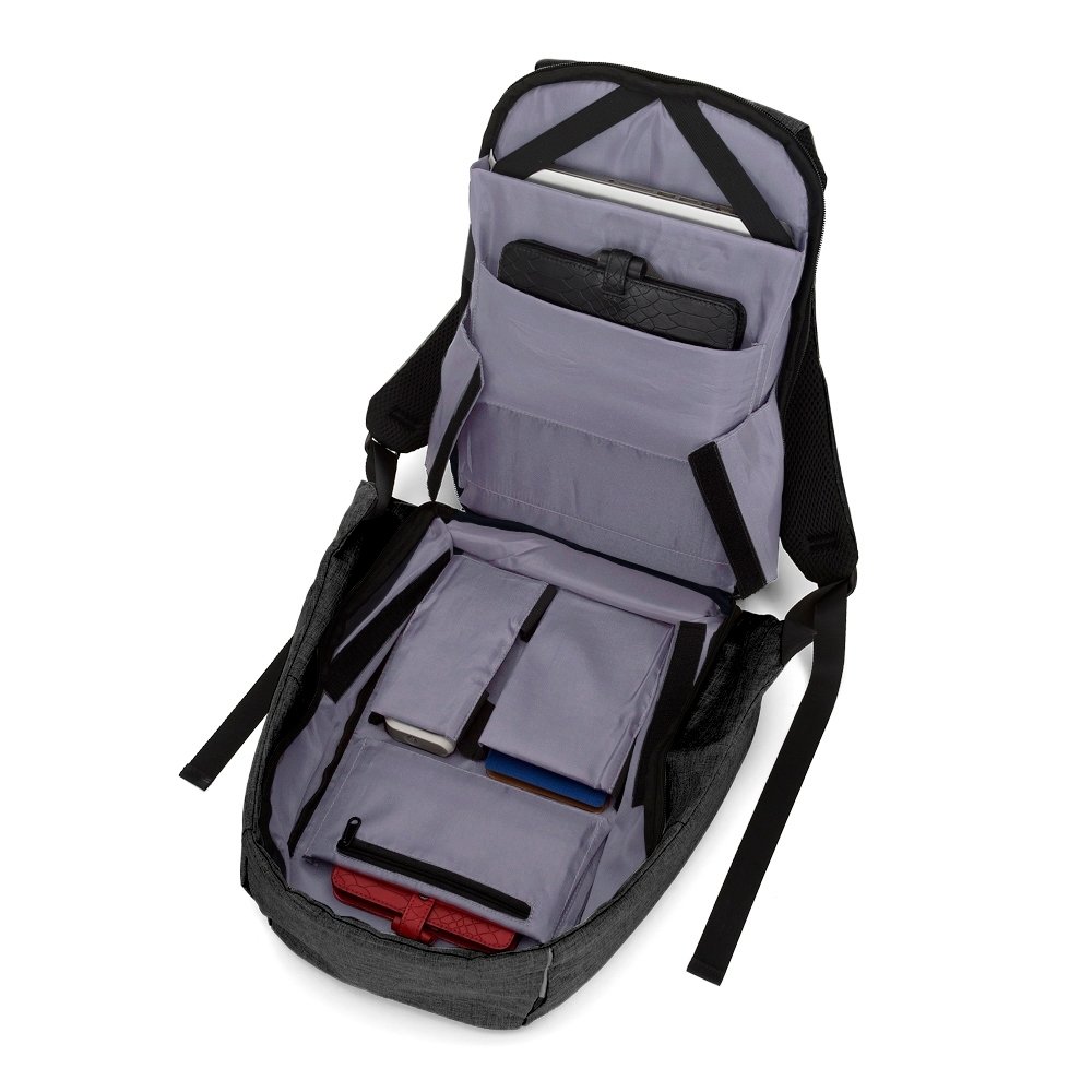Conta com dispositivo externo para conexão USB, com cabo acoplado internamente, permitindo conectar um carregador portátil na parte interna e utilizar o aparelho conectado externamente enquanto caminha. Na área interna do compartimento principal, possui bolso para notebook de até 15,6 polegadas, bolso dedicado para tablet e quatro bolsos organizadores para acessórios, além de sistema lateral interno com velcro, que reforça a segurança e estabilidade dos itens.